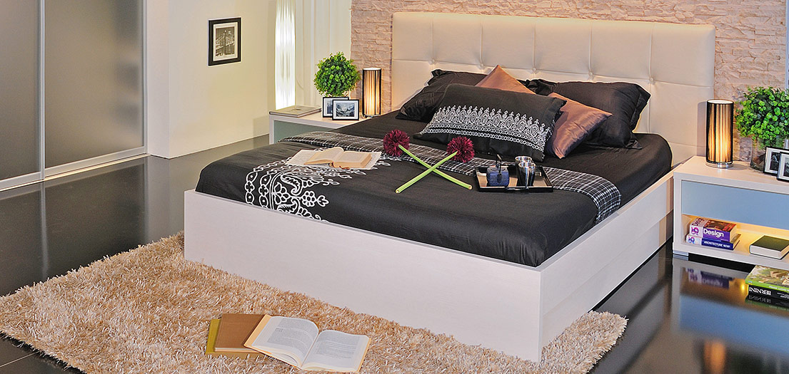 Zakonska postelja, prilagodljiva vsem dimenzijam, ki jo lahko obogatimo tudi z oblazinjenim vzglavjem. To naredi naredi posteljo še bolj udobno in prijetno za počivanje, predvsem pa ji daje bolj razkošen videz. Prostor pod vzmetnico lahko dodatno izkoristimo in vanj vgradimo predale.
